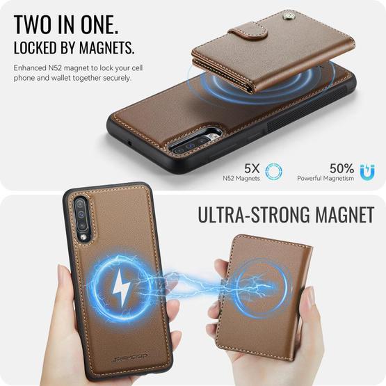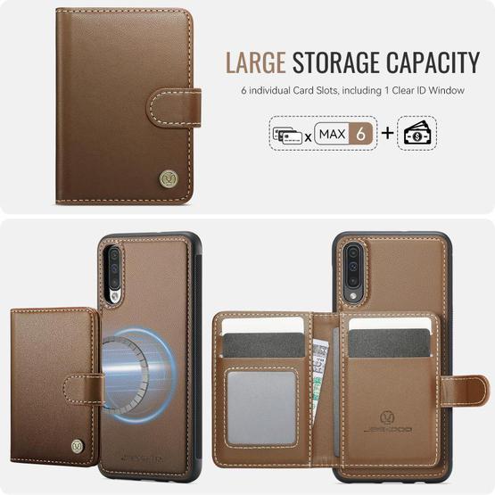 For Samsung Galaxy A50 JEEHOOD J09 Buckle Card Bag MagSafe Magnetic Style RFID Leather Phone Case(Brown)