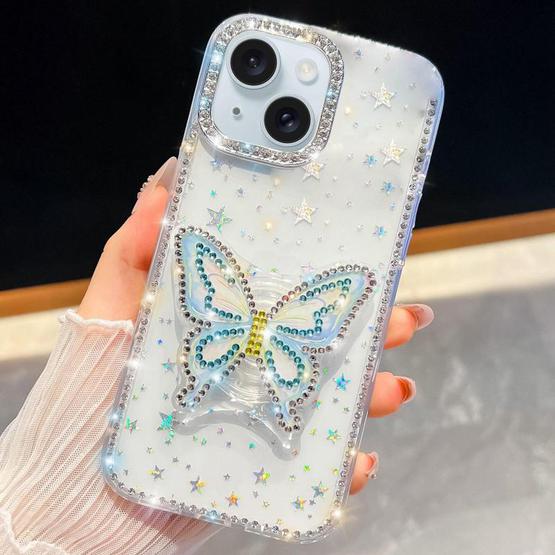 For iPhone 15 Diamond Glitter Butterfly Holder Phone Case(Transparent Stars)