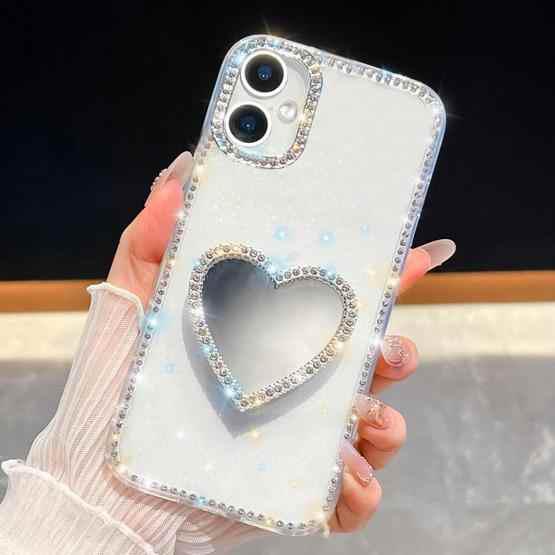 For iPhone 16 Diamond Glitter Mirror Heart Holder Phone Case(Transparent)