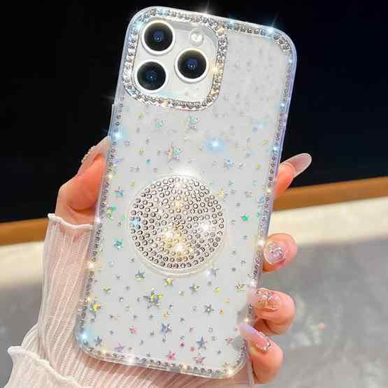 For iPhone 14 Pro Diamond Glitter Diamond Round Holder Phone Case(Transparent Stars)