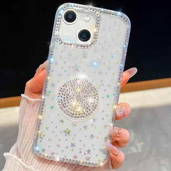 For iPhone 15 Diamond Glitter Diamond Round Holder Phone Case(Transparent Stars)