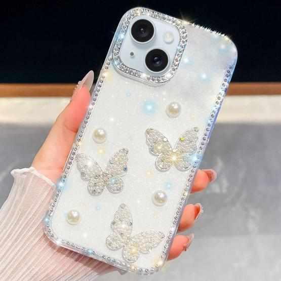 For iPhone 15 Diamond Glitter Pearl Butterfly Four-Corner Shockproof Phone Case(Transparent)