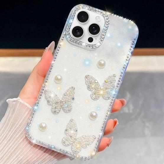 For iPhone 15 Pro Diamond Glitter Pearl Butterfly Four-Corner Shockproof Phone Case(Transparent)