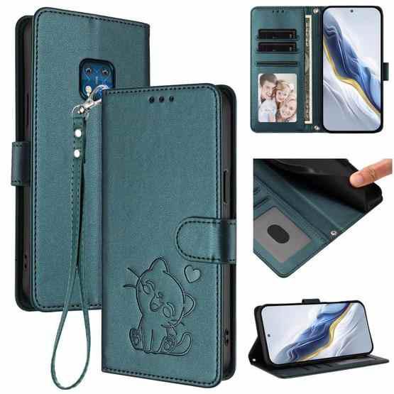 For Nokia XR20 Embossed Heart Cat Leather Phone Case with Strap(Dark Green)