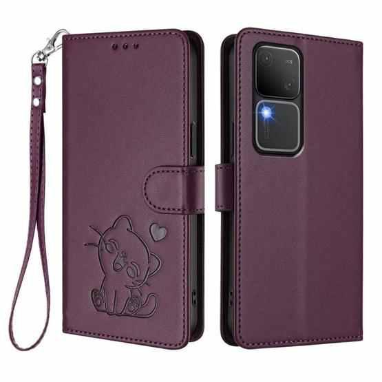 For vivo S18 / S18 Pro / V30 / V30 Pro Embossed Heart Cat Leather Phone Case with Strap(Dark Purple)