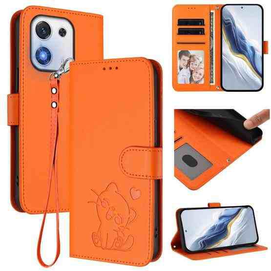 For Honor X70i Embossed Heart Cat Leather Phone Case with Hand Strap(Orange)