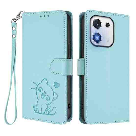 For Honor X70i Embossed Heart Cat Leather Phone Case with Hand Strap(Mint Green)