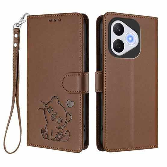 For Honor 400 Lite Global Embossed Heart Cat Leather Phone Case with Hand Strap(Brown)