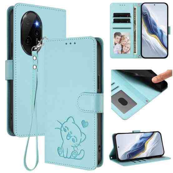 For Honor 100 Pro Embossed Heart Cat Leather Phone Case with Hand Strap(Mint Green)