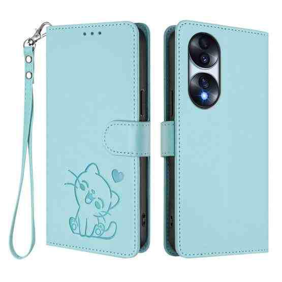 For Honor 70 Pro Embossed Heart Cat Leather Phone Case with Hand Strap(Mint Green)