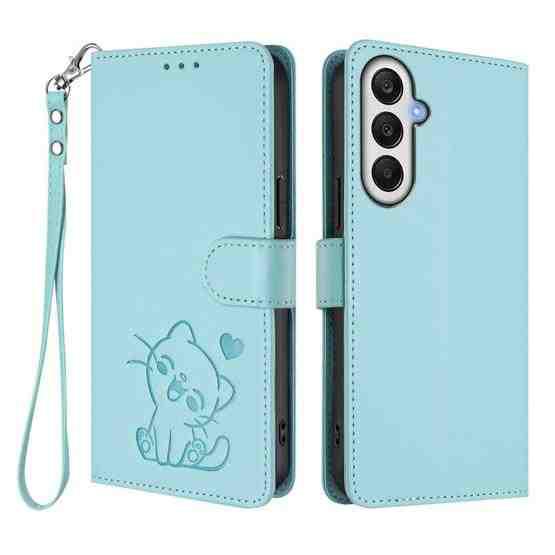 For Samsung Galaxy A05s / F14 4G Embossed Heart Cat Leather Phone Case with Hand Strap(Mint Green)