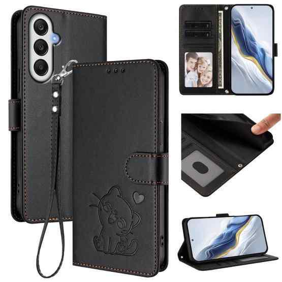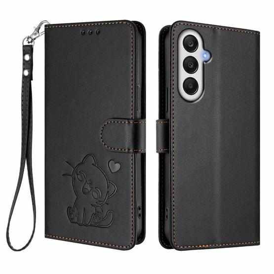For Samsung Galaxy A05s / F14 4G Embossed Heart Cat Leather Phone Case with Hand Strap(Black)