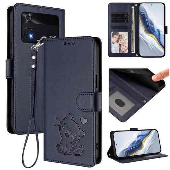 For Xiaomi Poco M4 Pro 4G Embossed Heart Cat Leather Phone Case with Hand Strap(Blue)