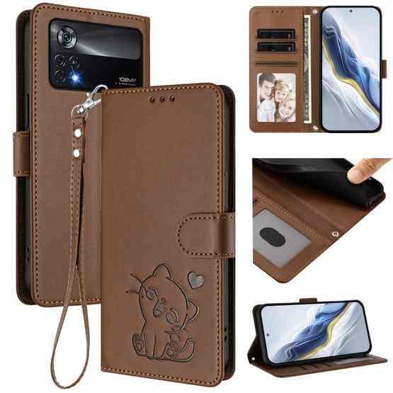 For Xiaomi Poco X4 Pro 5G Embossed Heart Cat Leather Phone Case with Hand Strap(Brown)