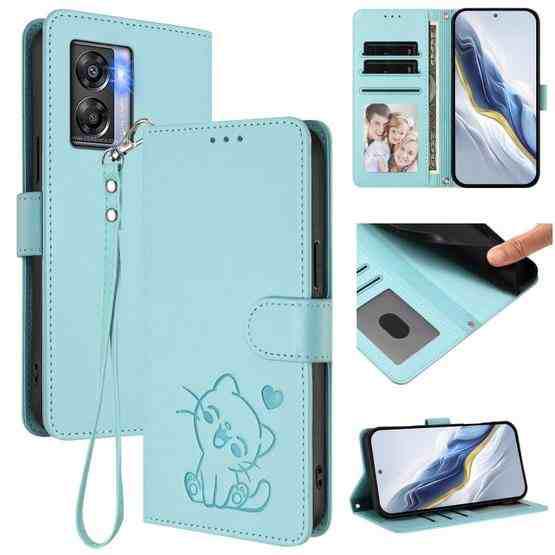 For OnePlus Nord N300 Embossed Heart Cat Leather Phone Case with Hand Strap(Mint Green)