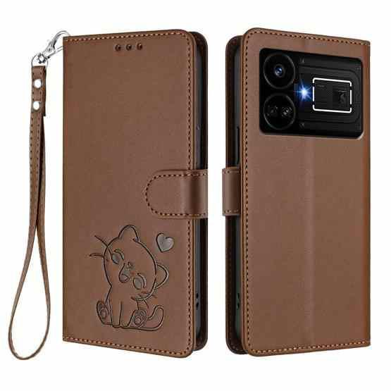 For Realme GT5 240W / GT5 5G Embossed Heart Cat Leather Phone Case with Hand Strap(Brown)