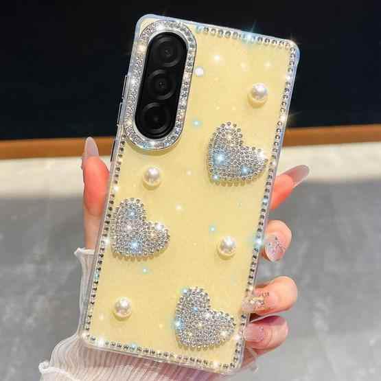 For Samsung Galaxy A36 5G Diamond Glitter Pearl Heart Four-Corner Shockproof Phone Case(Light Yellow)