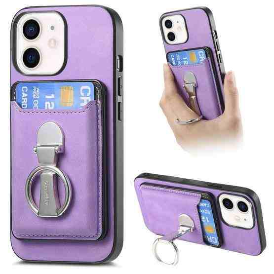 For iPhone 12 Retro Folding Ring Holder Card Bag MagSafe Phone Case(Purple)