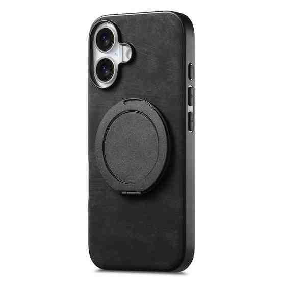 For iPhone 16 Retro Leather Rotation Round Holder Phone Case(Black)