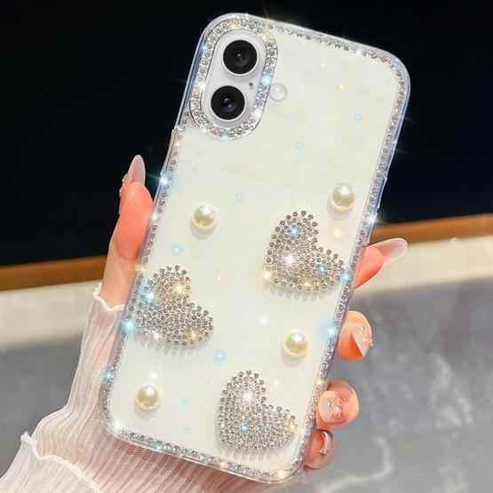 For iPhone 16 Plus Diamond Glitter Pearl Heart Four-Corner Shockproof Phone Case(White)